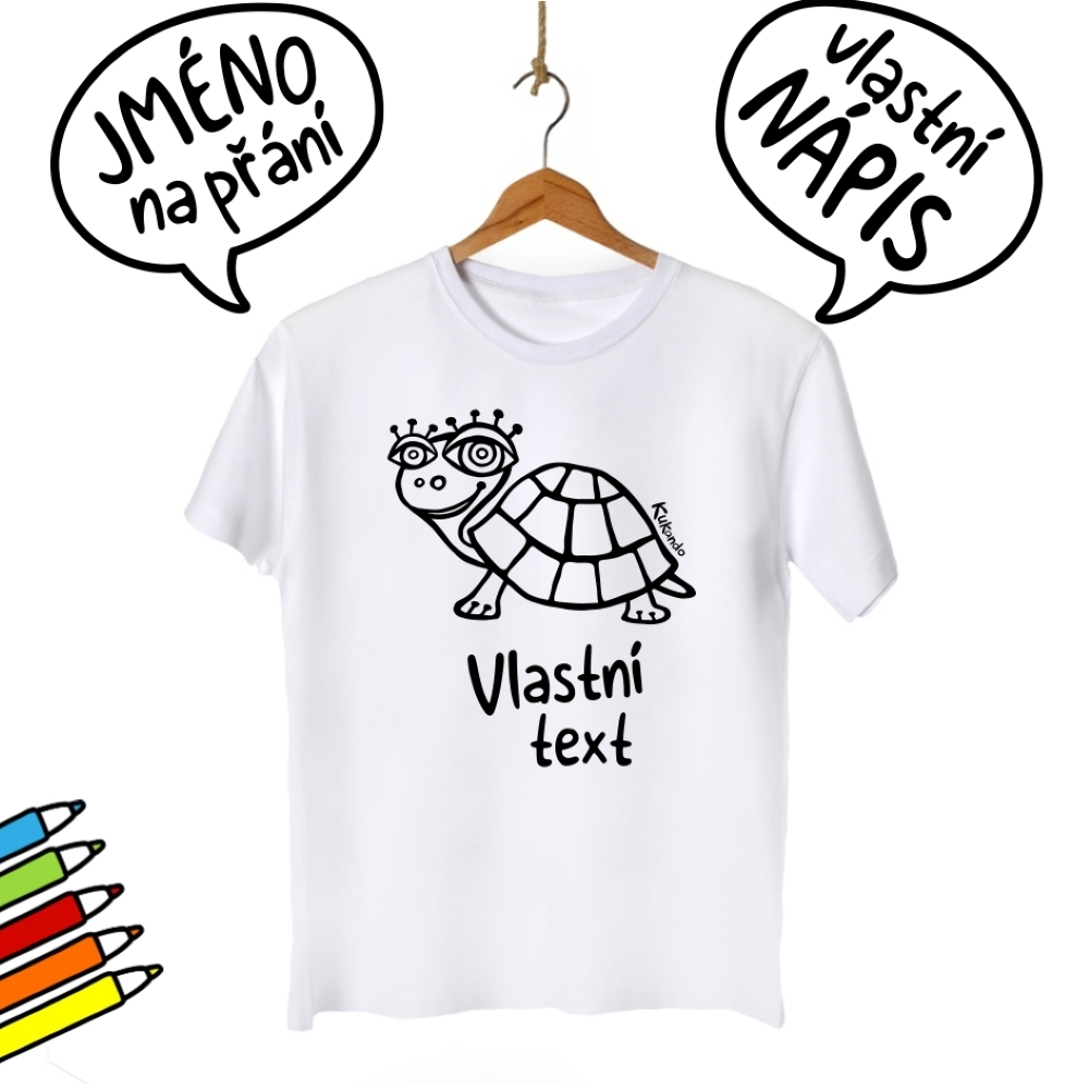 Veselé pánské tričko s textem na přání a s potiskem Kukando želvy – autorského obrázku, který jinde nenajdete :-) Popusťte uzdu své fantazii a udělejte z trička s pomocí fixů na textil skutečný originál!